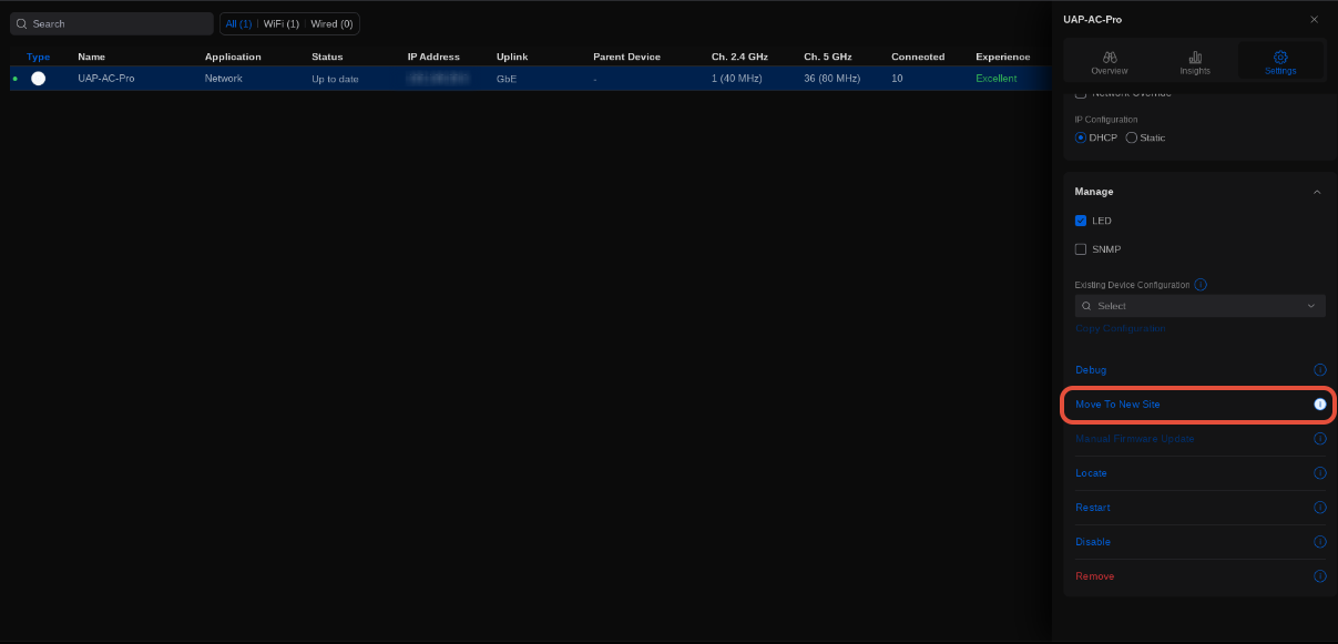 5. A pop-up will then appear with a list of sites that you can select to move the device to.